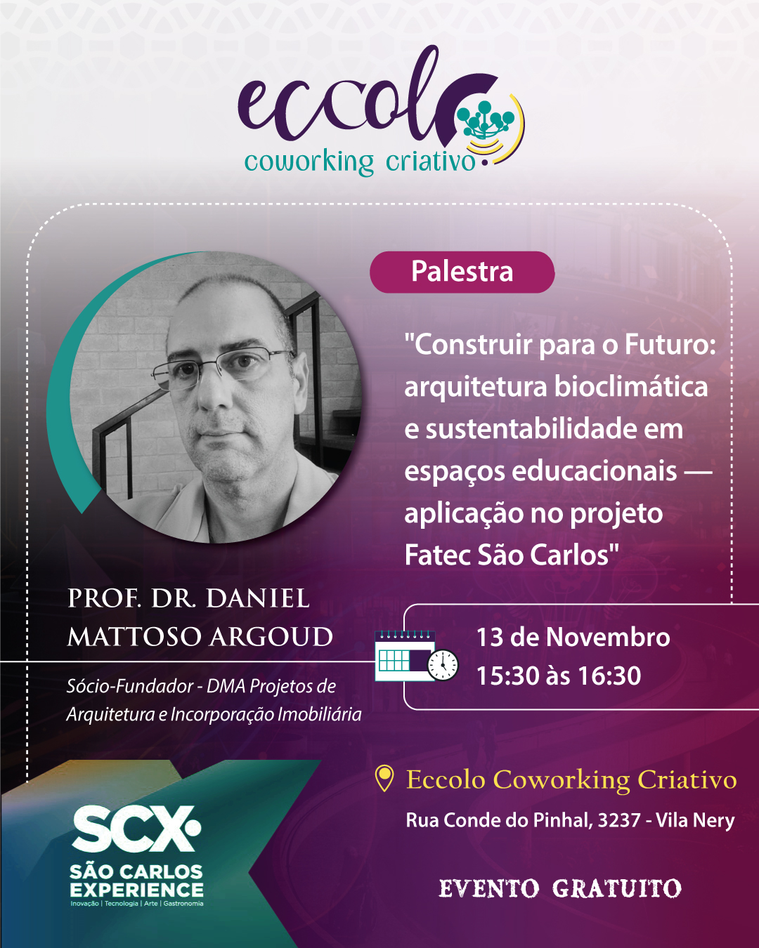 Descrição: Apresentar como a arquitetura bioclimática e os princípios de sustentabilidade podem transformar espaços educacionais em ambientes mais saudáveis, eficientes. A partir do projeto da Fatec São Carlos como estudo de caso, serão demonstradas soluções arquitetônicas que reduzem o consumo energético, valorizam a ventilação e iluminação natural e promovem o conforto térmico.