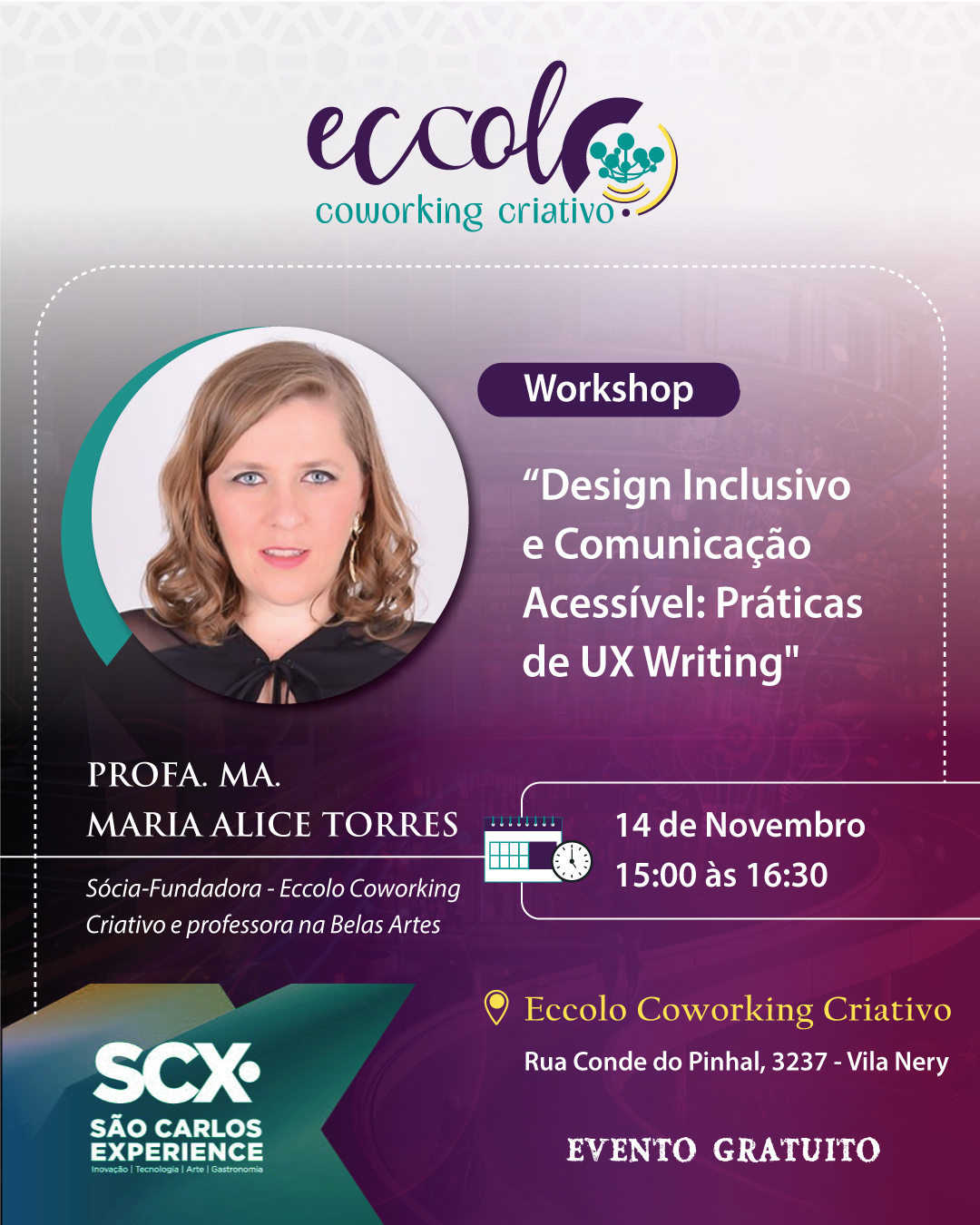 Descrição: Este workshop oferece uma experiência prática e colaborativa para aplicar os princípios de design inclusivo e UX Writing na criação de textos acessíveis. Os participantes aprenderão a utilizar técnicas de escrita clara, empática e inclusiva.